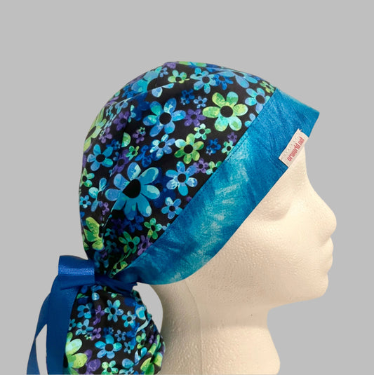Ponytail Style Hat - Blue and Lime flowers