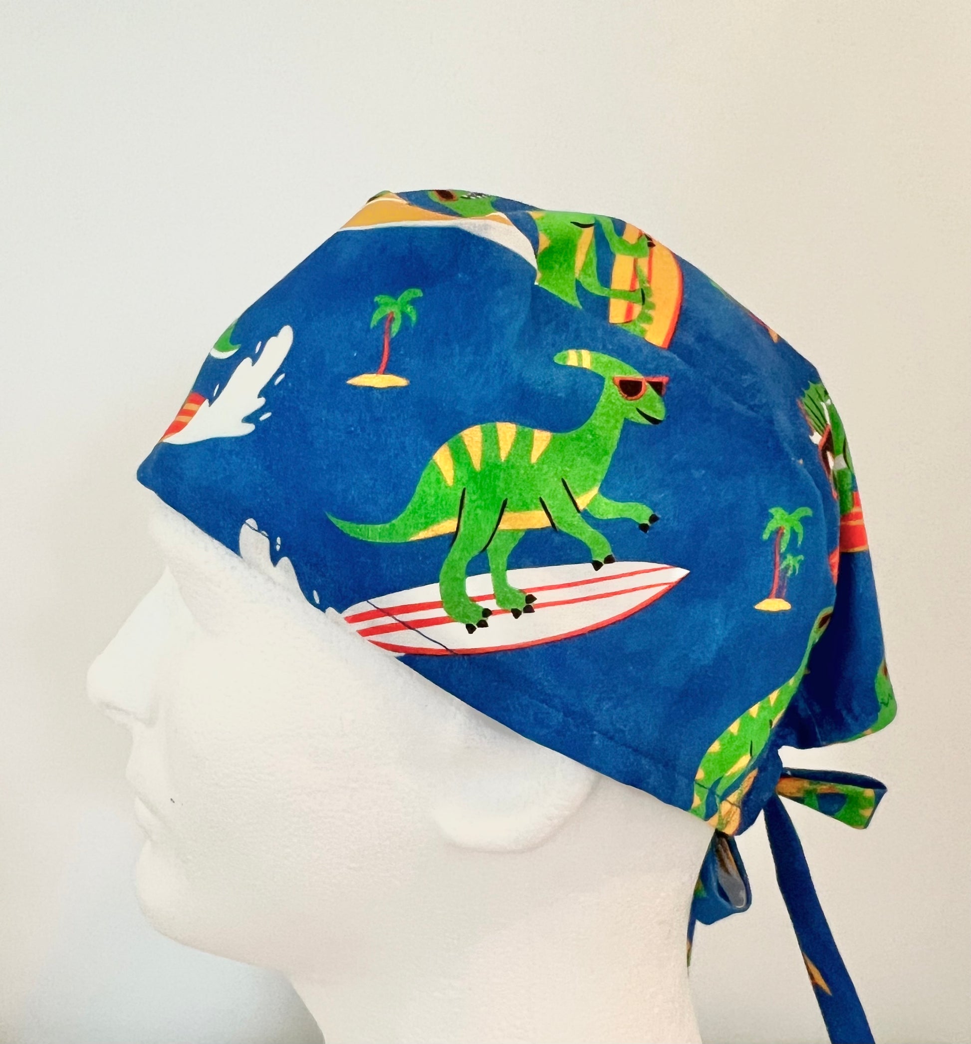 Catch a wave in style with this fun and vibrant Surfing Dinosaur Scrub Cap! Featuring a cool green dinosaur rocking sunglasses while surfing on a bright blue tropical background, this cap brings playful summer vibes to your workday.